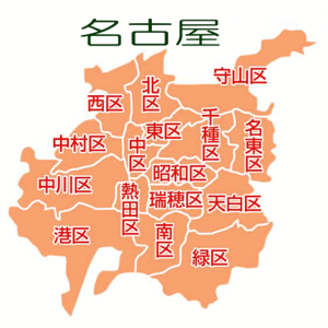 | 中村区 | 千種区 | 東区 | 北区 | 西区 | 中区 | 昭和区 | 瑞穂区 | 熱田区 | 中川区 | 港区 | 南区 | 守山区 | 緑区 | 名東区 | 天白区 |