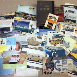 スバル・パブリカ・ダットサン・メグロオートバイ・ラビットなどの古い自動車・オートバイのパンフレット